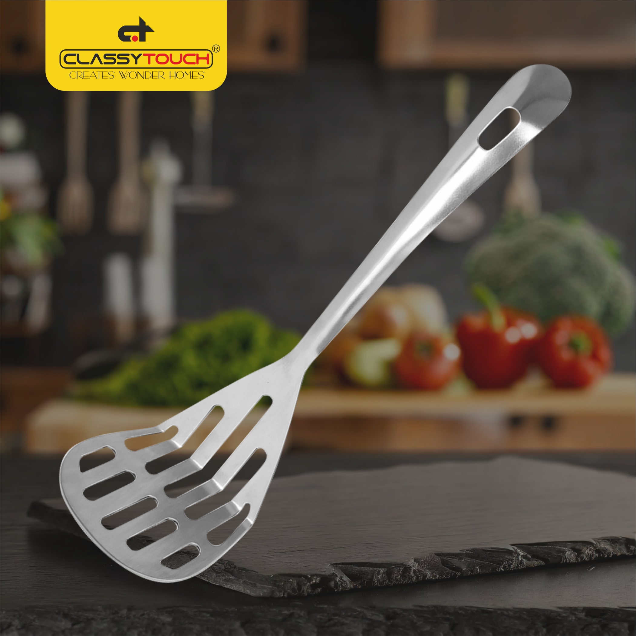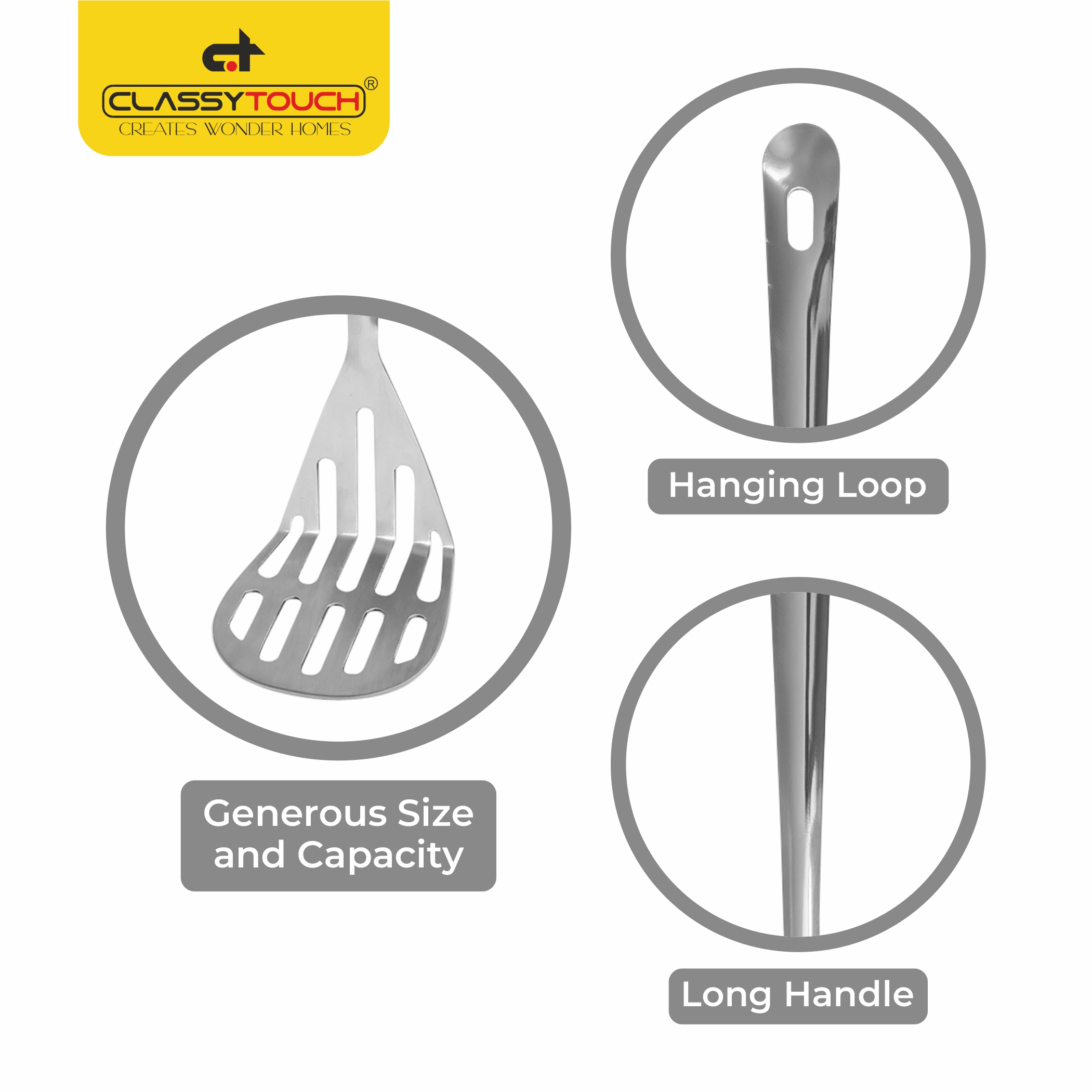 This ClassyTouch stainless steel slotted turner spoon is an essential kitchen tool designed to make cooking and serving effortless. Measuring 22.5 cm in length with a generous 7.5 cm wide head, this turner offers ample size and capacity to handle everything from delicate fish fillets to hearty vegetables. The slotted design allows excess oil and liquids to drain away, ensuring your food stays perfectly cooked without becoming soggy. Crafted from durable stainless steel, this turner is built to withstand daily use whilst maintaining its sleek silver finish. The long handle provides excellent reach and keeps your hands safely away from heat during cooking, whilst the ergonomic design ensures comfortable grip and control. A convenient hanging loop at the top makes storage simple and keeps your kitchen organised. Easy to clean and maintain, this versatile kitchen utensil is perfect for flipping, turning, and serving a variety of dishes. Whether you’re sautéing vegetables, frying eggs, or serving pasta, this ClassyTouch slotted turner spoon combines functionality with style to enhance your cooking experience.