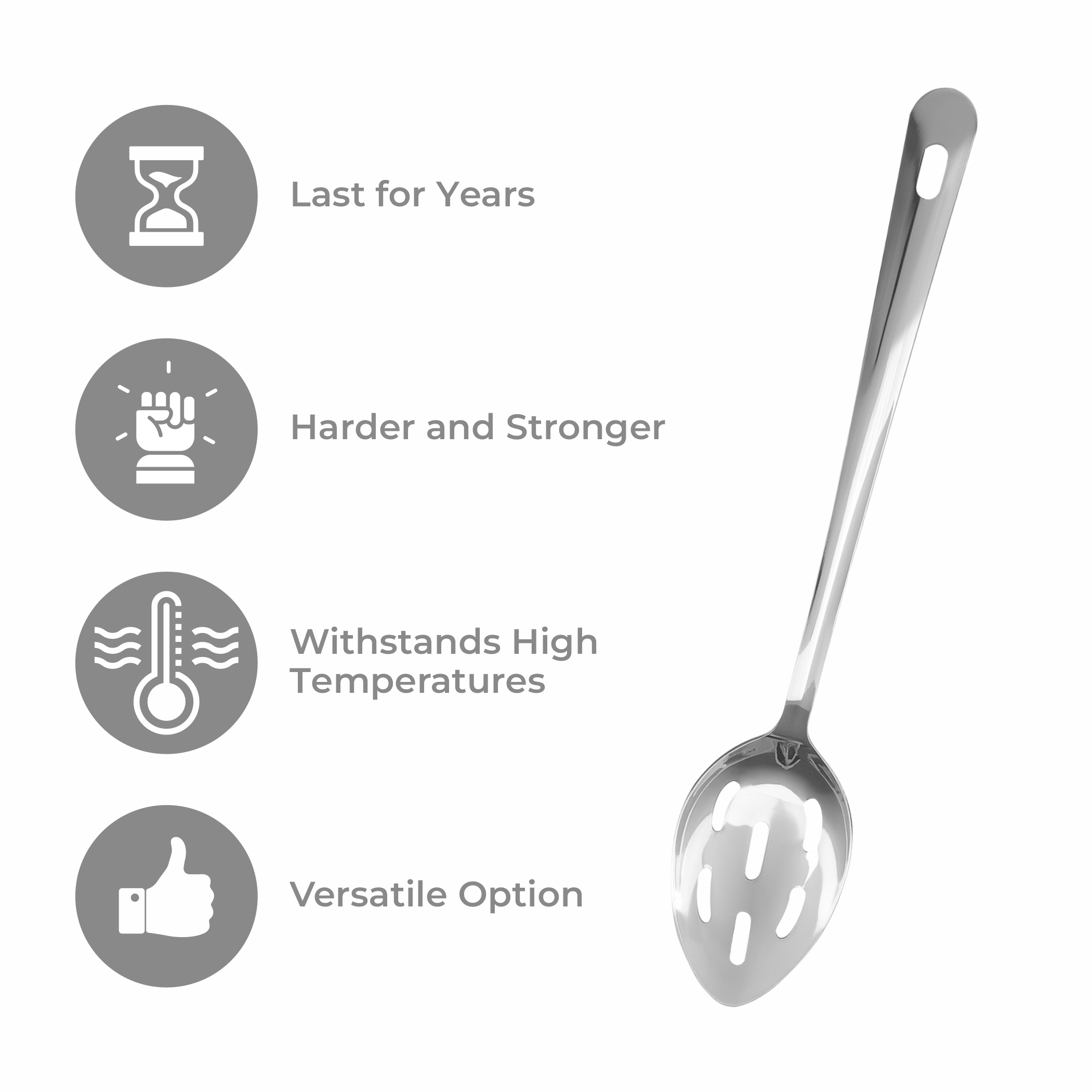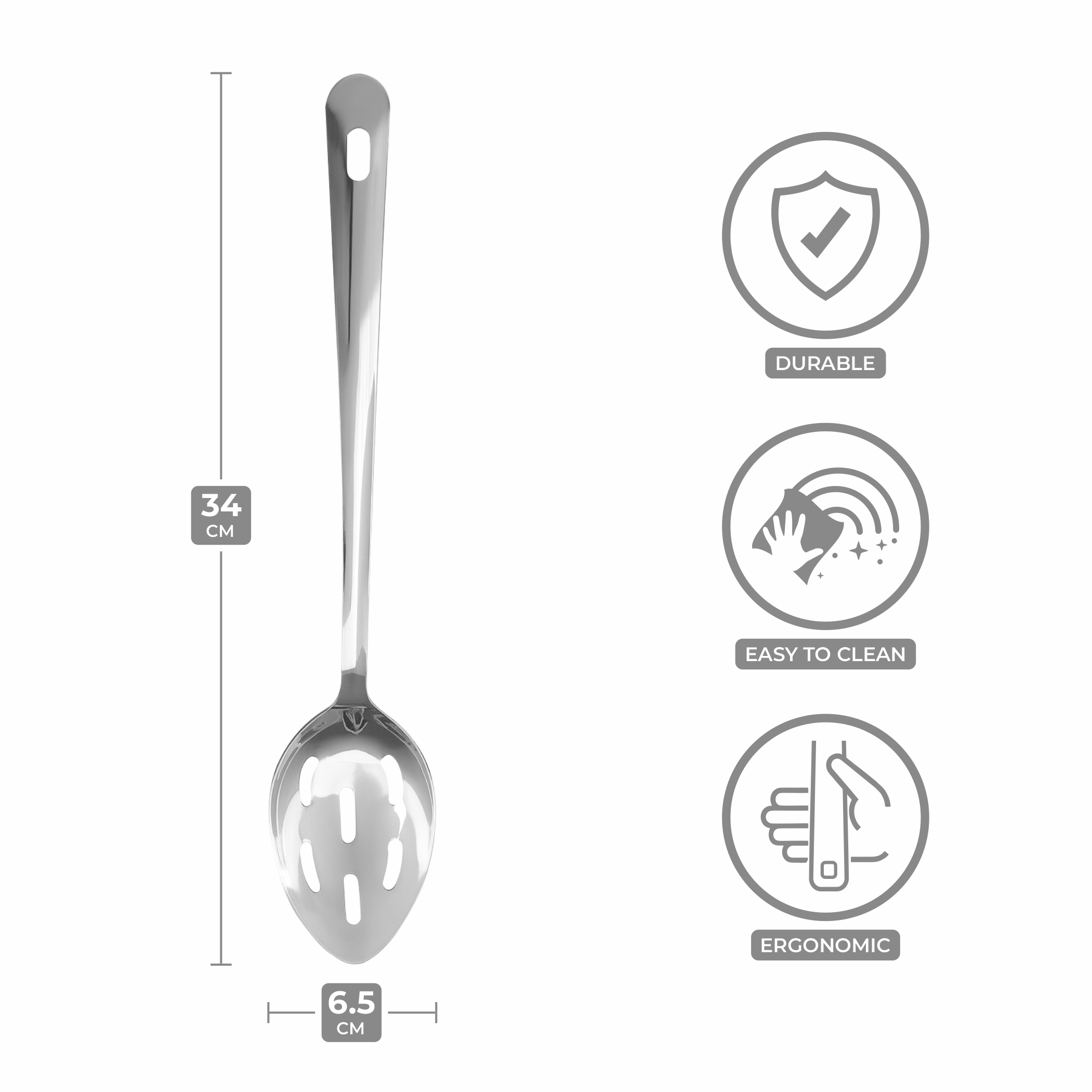 GENEROUS DIMENSIONS: Measures 34 cm in total length with a 6.5 cm wide slotted spoon head, providing ample capacity for straining and serving various foods efficiently