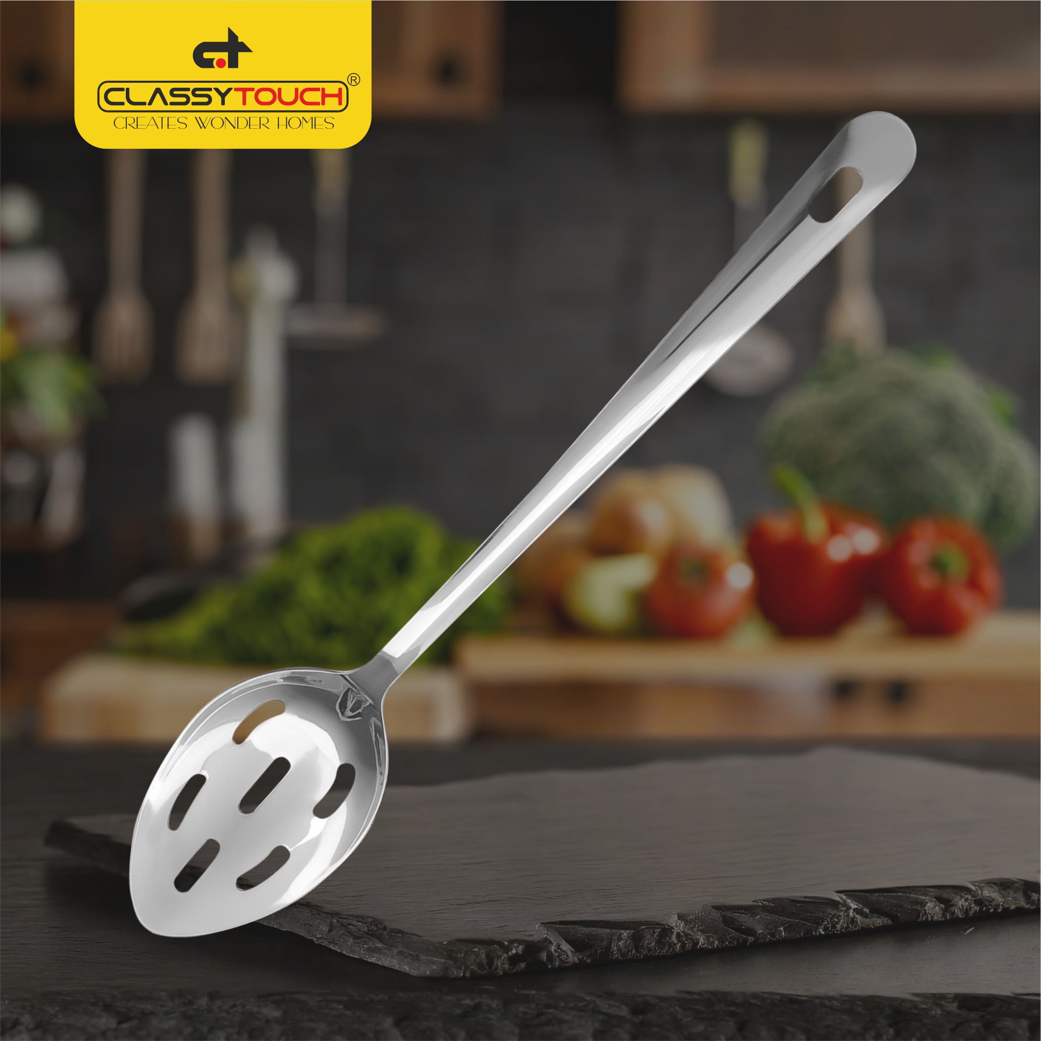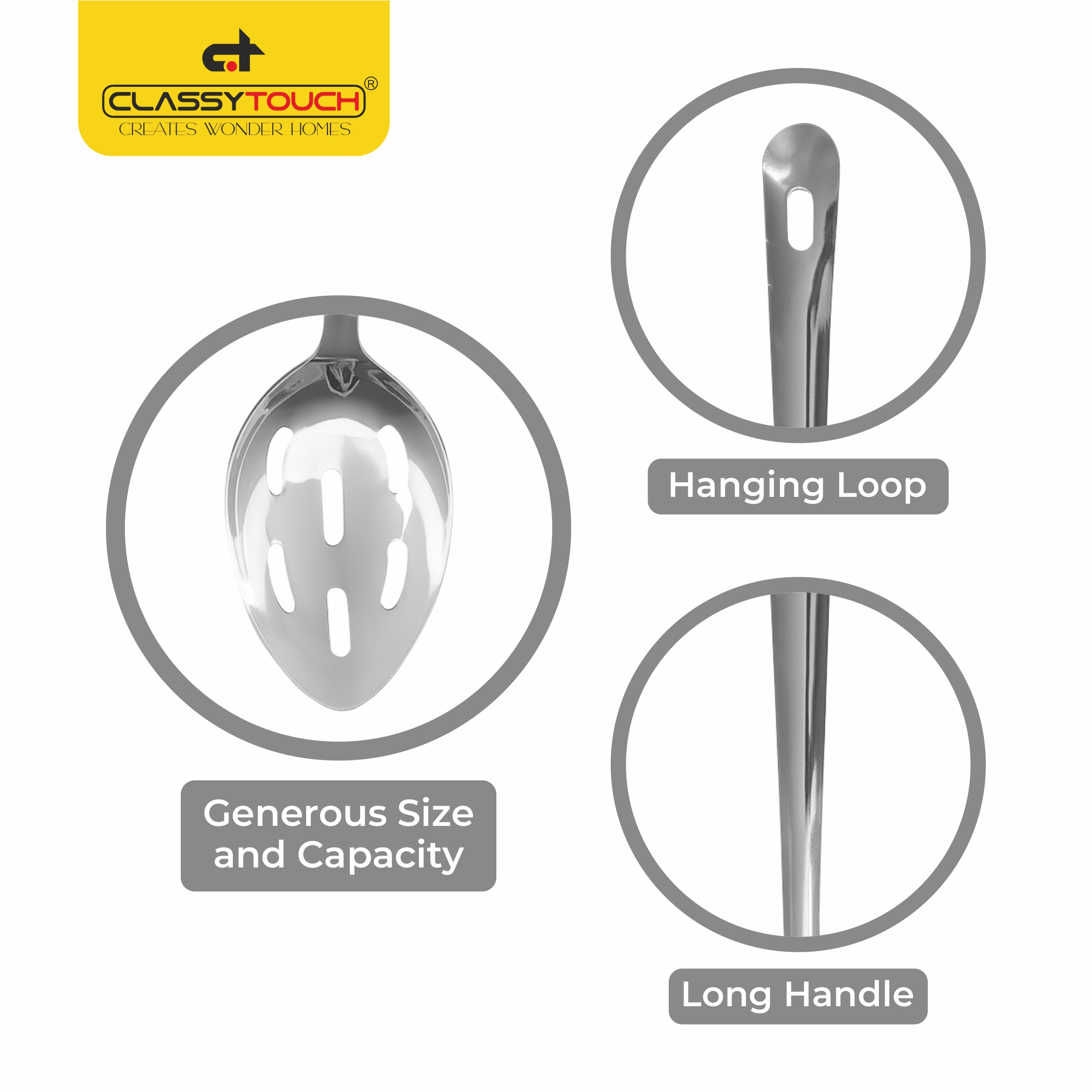 Add to WishlistAdd to CompareThis ClassyTouch stainless steel slotted spoon is an essential kitchen tool designed to make cooking and serving effortless. Measuring 34 cm in length with a 6.5 cm wide head, this generously sized utensil provides excellent capacity for straining, serving, and transferring food with ease. The thoughtfully designed slots allow liquids to drain away efficiently whilst retaining solid ingredients, making it perfect for retrieving vegetables from boiling water, serving pasta, or skimming stocks and soups. The long handle keeps your hands safely away from heat whilst providing excellent reach into deep pots and pans. Crafted from durable stainless steel, this slotted spoon is built to withstand daily kitchen demands whilst maintaining its sleek appearance. The ergonomic handle features a comfortable grip design that reduces hand fatigue during extended cooking sessions, and includes a convenient hanging loop for easy storage. Easy to clean and maintain, this versatile kitchen companion is an indispensable addition to any home cook’s utensil collection. Whether you’re preparing everyday meals or elaborate feasts, this ClassyTouch slotted spoon delivers reliable performance and practical functionality.