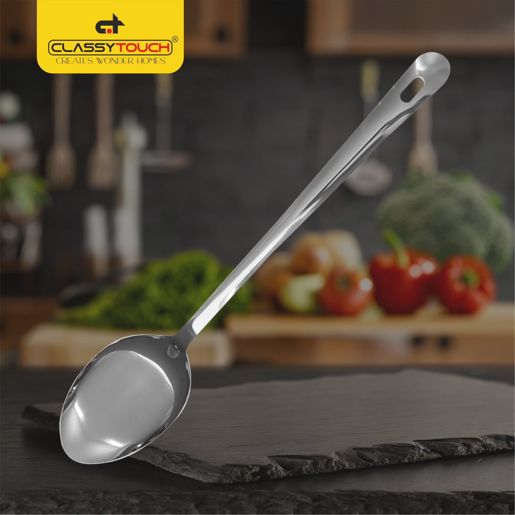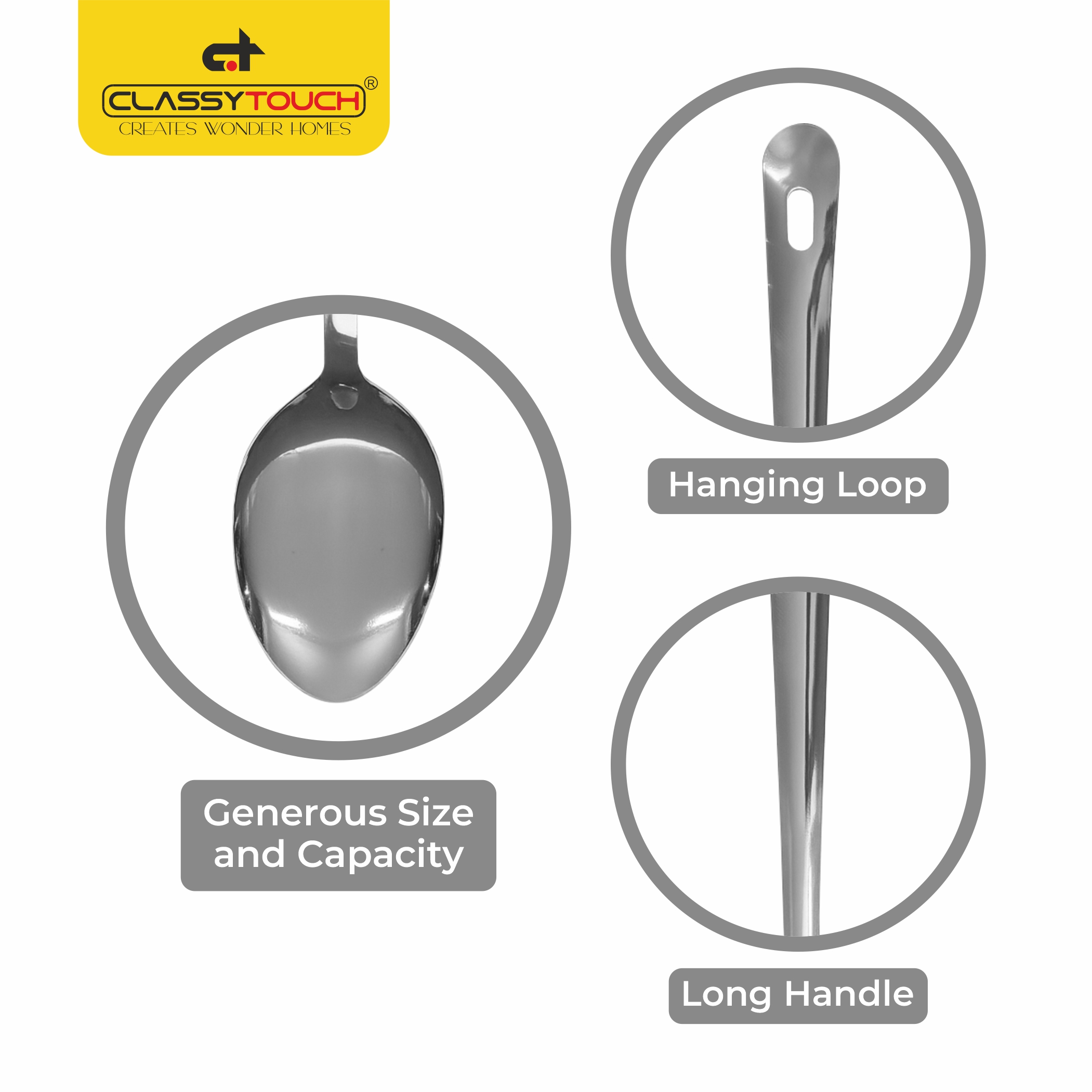 Add to WishlistAdd to CompareThis ClassyTouch stainless steel serving spoon is an essential addition to any kitchen, combining functionality with elegant design. Measuring 34 cm in length with a generous 6.5 cm wide bowl, this serving spoon offers the perfect size and capacity for serving a variety of dishes, from hearty stews to delicate rice preparations. The long handle provides comfortable reach into deep pots and serving dishes, whilst keeping your hands safely away from heat. Crafted for durability, this stainless steel spoon is built to withstand daily use in busy kitchens. Its robust construction ensures it won’t bend or break easily, making it a reliable tool for years to come. The ergonomic design fits comfortably in your hand, reducing strain during extended serving sessions. Cleaning is effortless thanks to the smooth stainless steel surface that resists staining and doesn’t retain odours. A convenient hanging loop at the handle end allows for easy storage, keeping your kitchen organised and your utensils within reach. Whether you’re serving family meals or hosting dinner parties, this versatile serving spoon handles every task with ease.